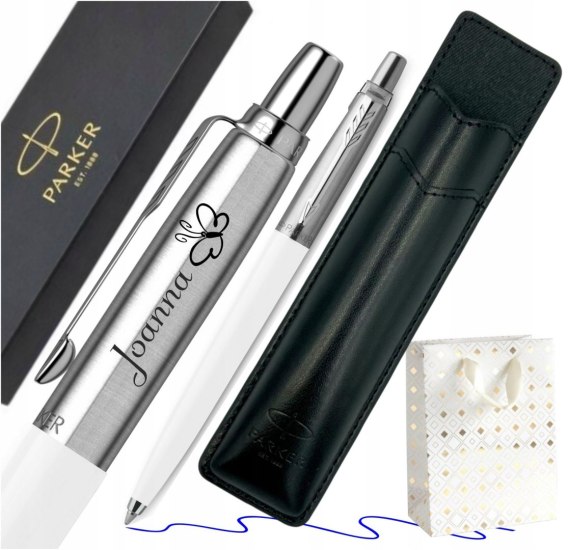 Długopis Parker Jotter Biały z grawerem i czarnym etui to elegancki i spersonalizowany zestaw prezentowy. Doskonały wybór dla osób poszukujących parker z grawerem, które chcą podarować stylowy i wyjątkowy upominek.